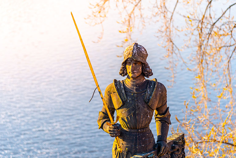 Statue of Bruncvik – legendary Czech knight – near Charles Bridge in Prague, Czech Republic.